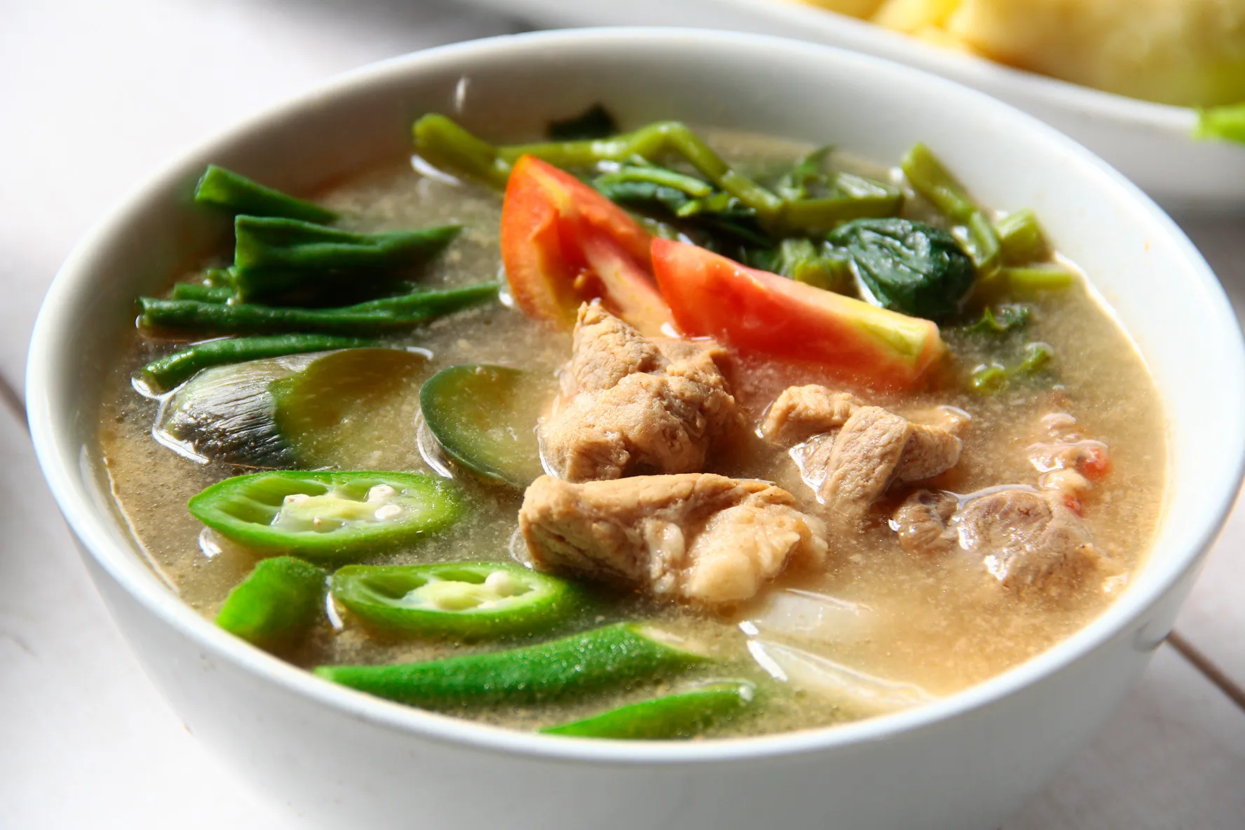 シニガンは日本のお味噌汁にあたる家庭料理。肉や魚介を、オクラ、トマト、ナスなどの野菜と煮て、タマリンドで酸味をきかせた具だくさんのスープ。