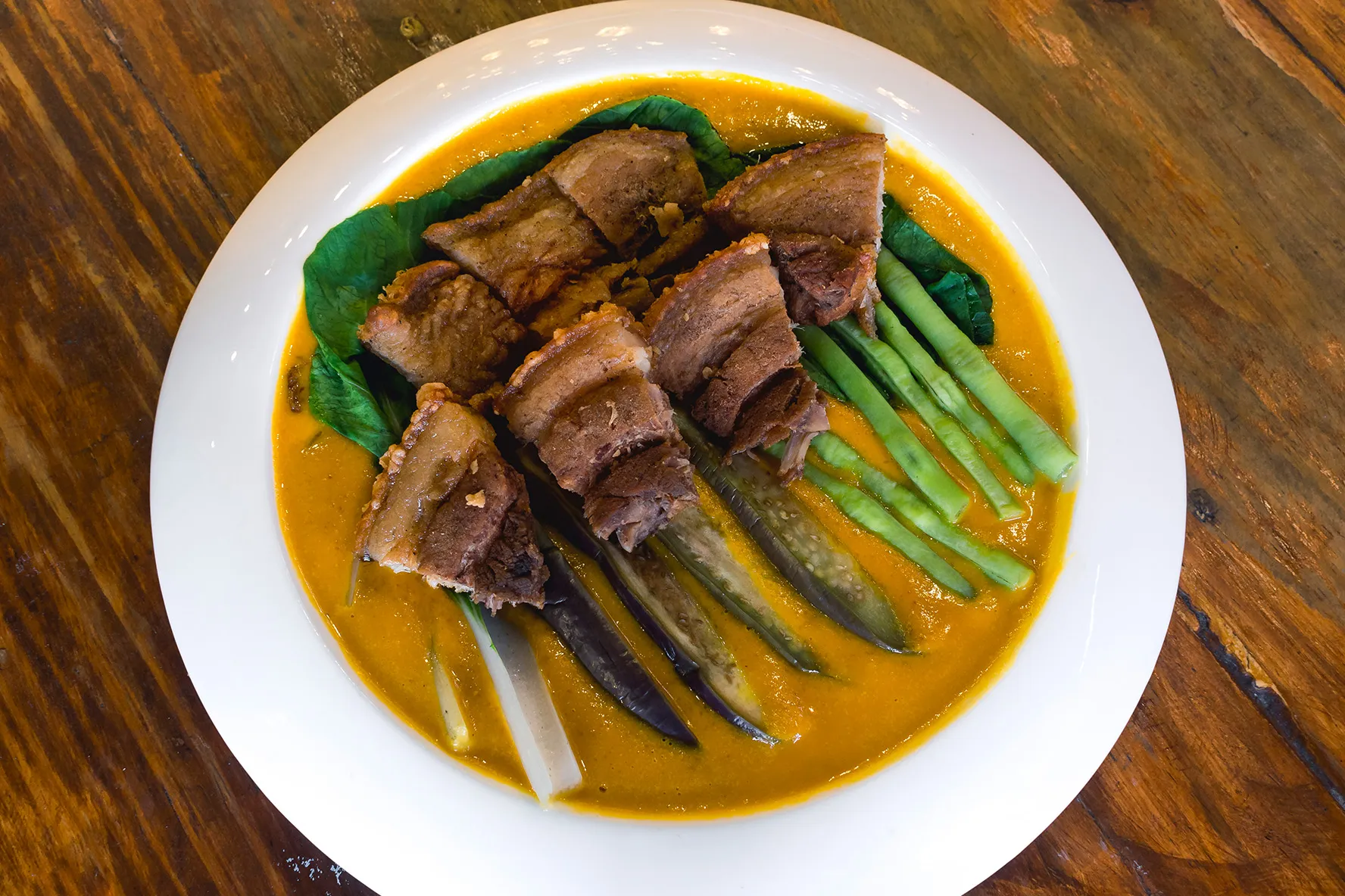 カレカレは牛肉と野菜をピーナッツソースで煮込んだフィリピンのシチュー。バゴーンという発酵調味料を混ぜると違った味が楽しめる。