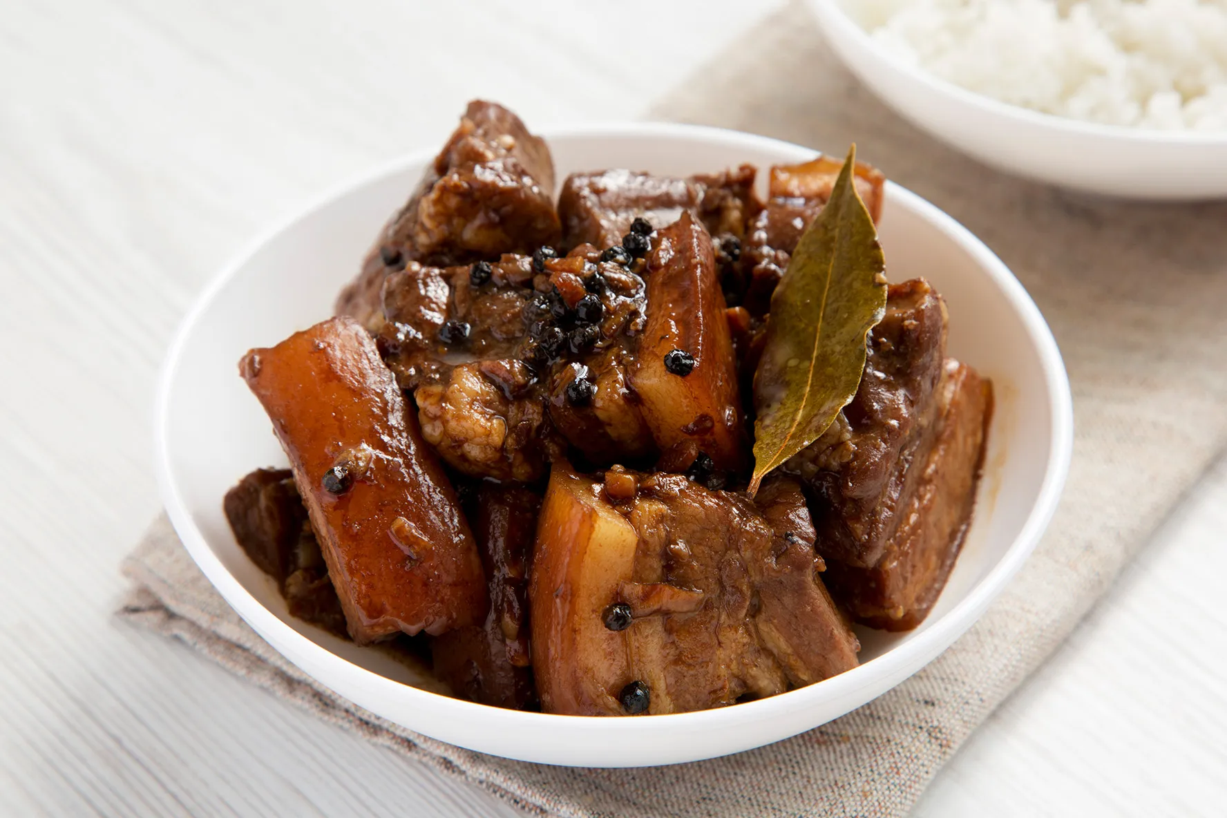 アドボは豚肉などをニンニクや酢、醤油、胡椒と一緒に煮込んだ甘酸っぱい料理。植民地時代にスペイン人がこの料理を見て、酢に漬けるという意味をもつ、アドバール、と呼んだのが料理名の由来と言われている。
