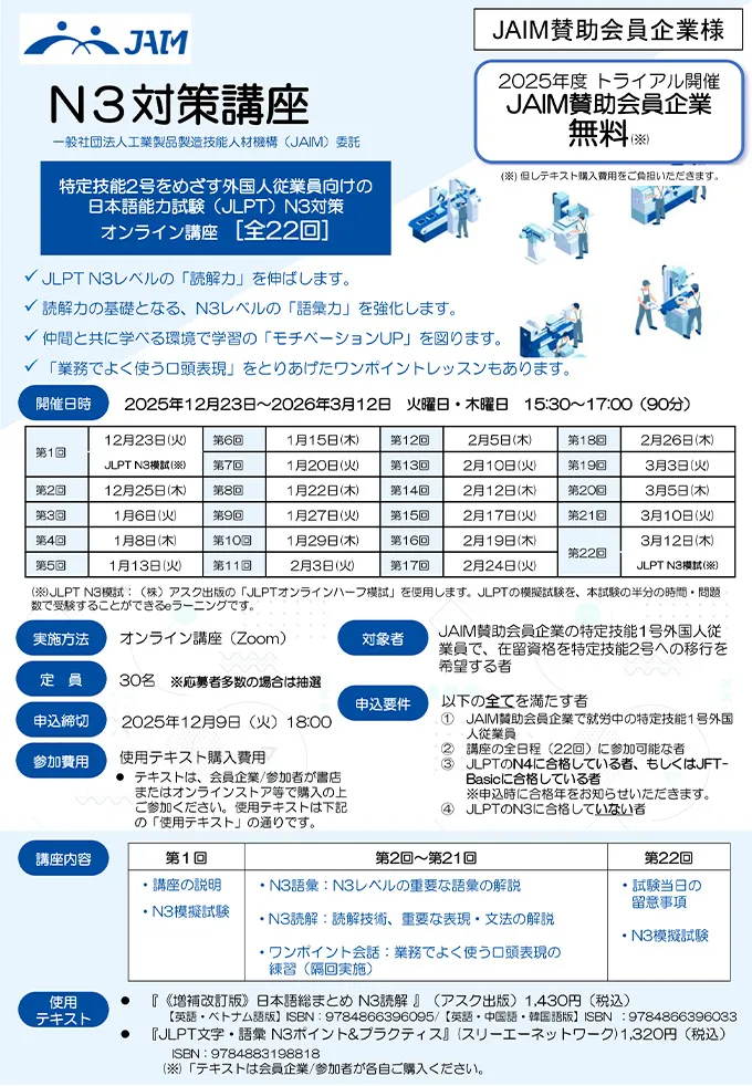 特定技能2号をめざす外国人従業員向けの日本語能力試験(JLPT)N3対策