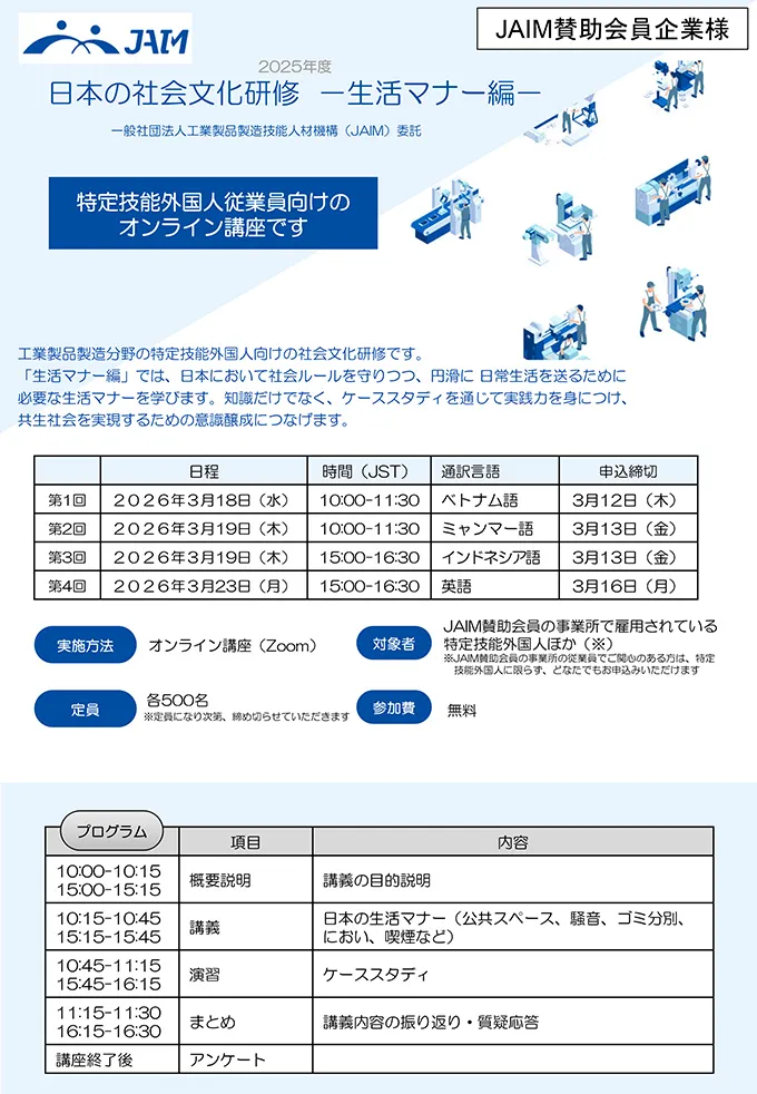 - JAIM賛助会員の事業所の従業員でご関心のある方は、特定技能外国人に限らず、どなたでもお申込みいただけます